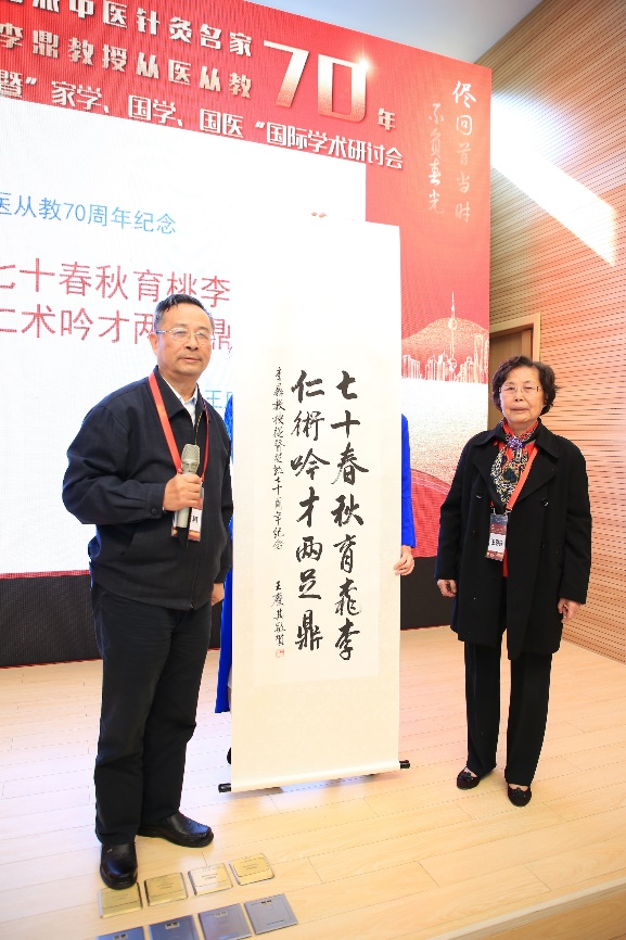 刘保延、曹锡康、徐建光、黄宪生、方剑乔、张怀琼、朱兵、吴焕淦、吴继东、周逸平、房敏共同为第五批国家级非物质文化遗产“针灸”项目代表性传承人李鼎教授举行揭牌仪式。 开幕式后,黄龙祥、王庆其、胡军、吴继东、徐平等专家学者分别围绕勤学古典、仁术吟才、调气治神、古典经络与现代浮针、传承心悟等方面讲述李鼎教授从医从教70年的历程,及其学术思想的传承与发展。王庆其向李鼎教授赠送墨宝“七十春秋育桃李,仁术吟才两足鼎”。 李鼎教授的代表性学术著作、诗文书法作品等在本次研讨会的开幕式上一并展出。 (探花视频 ) |