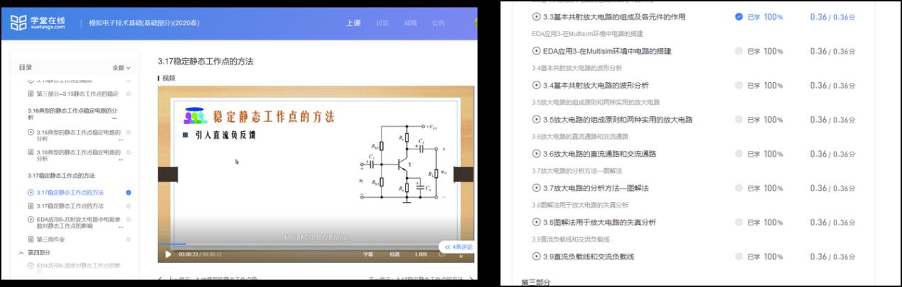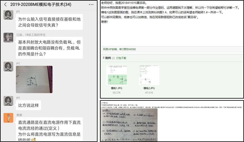 在线教学开展前,对本门课程的自主学习与考核方案做了精心设计。本课程选择学堂在线慕课平台上清华大学模拟电子技术基础作为线上免费学习资源,该视频与本课程使用的教材完全匹配,整套视频均由1个知识点精讲微视频+几道配套作业组成(1)。学生在完成每个知识点的学习后,可以线上练习配套作业及时检验学习效果,如对新知识有不理解的地方,学生可以反复进行学习,提高学习效果。充分利用学校课程中心资源,将本门课程的课件资料、自主学习方案(教学进度计划、课后作业、答疑安排等)与考核方案,提前发布在课程中心网站(2)。自主学习开展前,在课程微信交流群中提醒学生登录学校课程中心获取本门课程的在线教学信息,了解具体的自主学习与考核方案,针对学生有疑问的地方及时解释,保证自主学习顺利开展。
