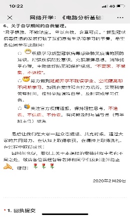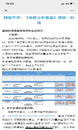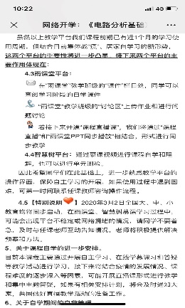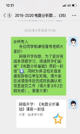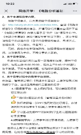 《电路分析基础》分享的“网络开学课前一封信”,让同学们迅速了解接下来的教学安排、考核形式、学习资源获取途径、在线学习达到的目标和要求等等,并保证学生全员通知到位,使用学生们“不打无准备之仗”。