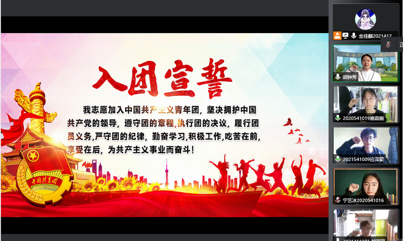 为庆祝中国共产主义青年团成立100周年,全面贯彻习近平新时代中国特色社会主义思想,深入学习贯彻习近平总书记在中国人民大学考察时的重要讲话精神,引导广大团员青年厚植爱国情怀,以实际行动迎接党的二十大召开,5月1日,在“五四”青年节到来之际,探花视频 团委组织开展“入团云宣誓”仪式。5名新发展的团员庄严宣誓,其他与会团员重温了入团誓言。